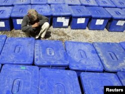 Шайлоо комиссиясынын кызматкери бюллетендер салынган кутулардын арасында. Кандагар провинциясы. 16-сентябрь 2010