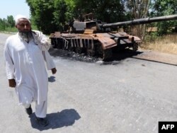 Талип согушчандары кыйрткан Пакистан армиясынын танкы. Бунер аймагындагы Пир Баба кыштагы. 22-май 2009