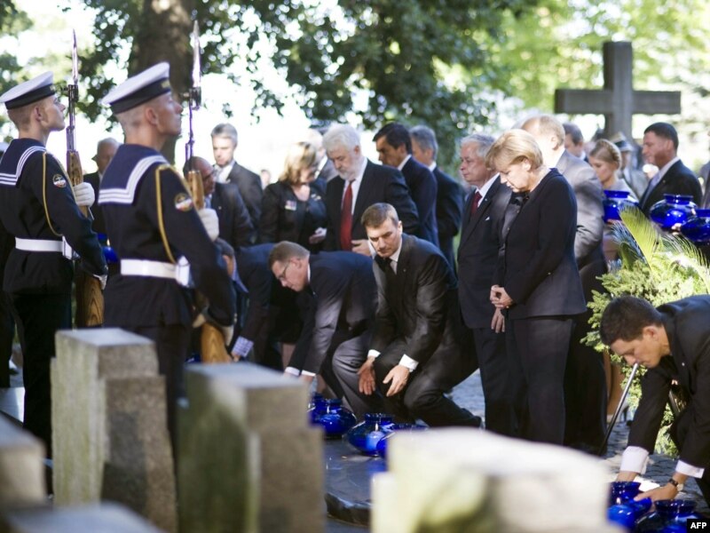 Европа өлкөлөрүнүн лидерлери Экинчи Дүйнөлүк согуштун башталганын 70 жылдыгына арнап, Польшанын Гданск шаарындагы эстеликке гүл чамбарларды койушууда. 1-сентябрь 2009-ж.