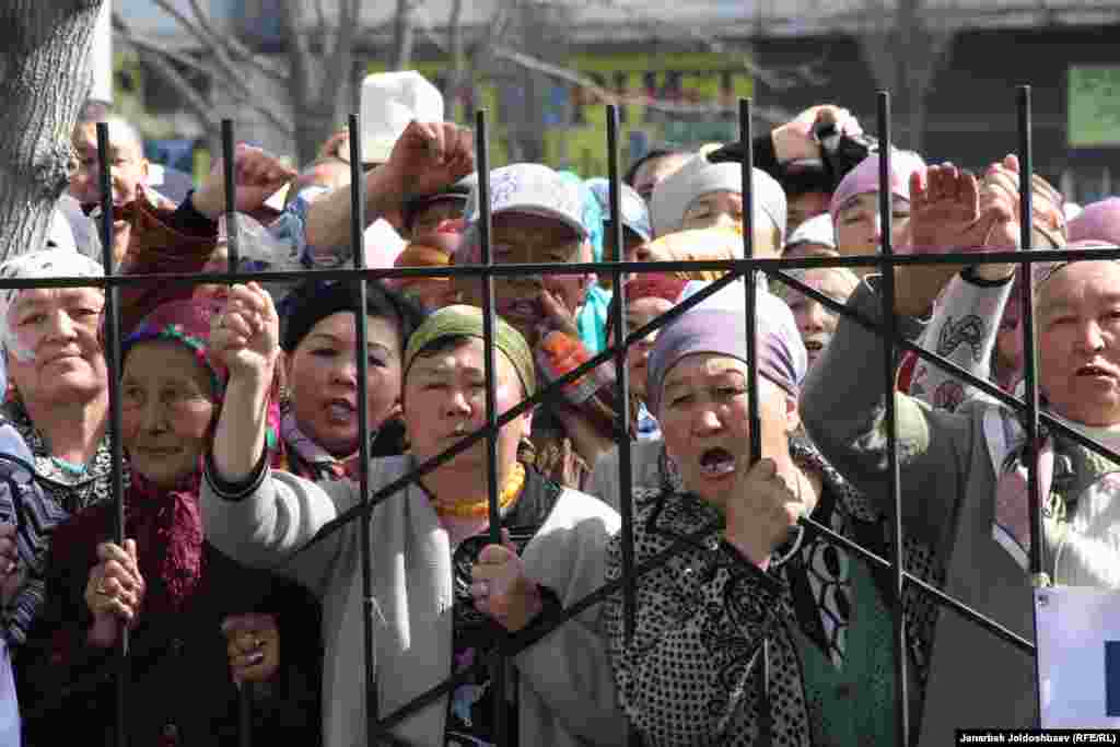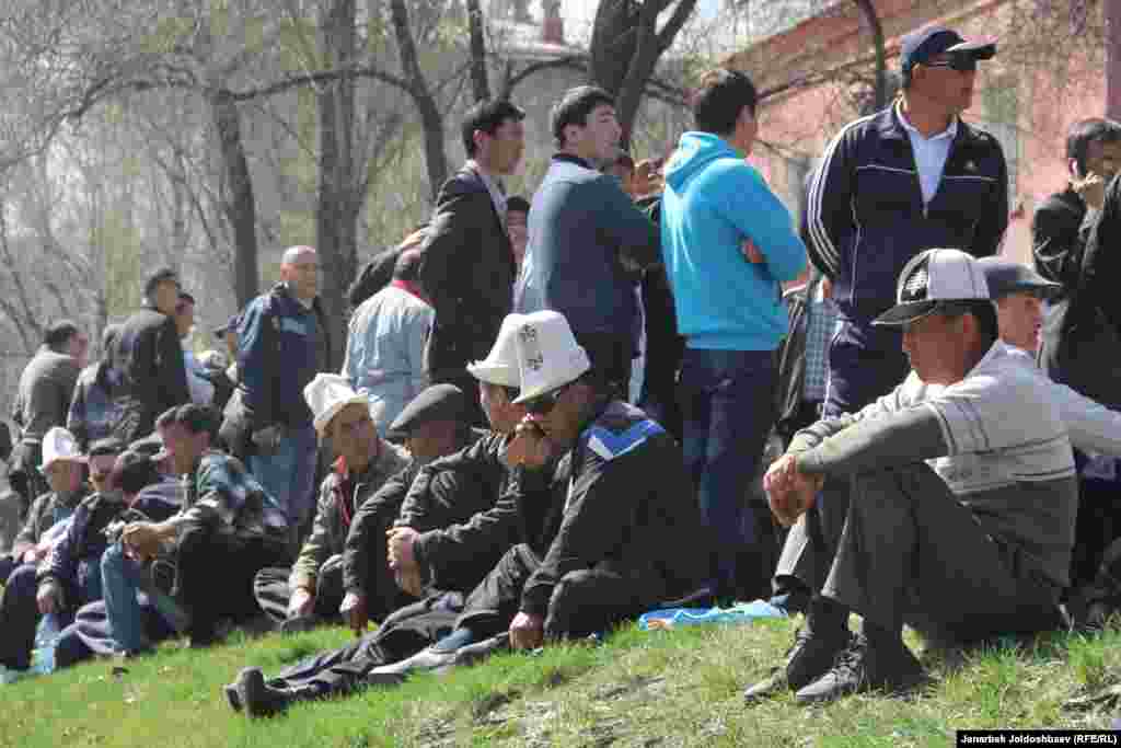 Бишкектин Биринчи Май райондук сотунун алдында 150-200 киши топтолуп турат. Алар соттолуп жаткан депутаттардын бошотулушун талап кылышууда. (Жанарбек Жолдошбаевдин сүрөт баяны)