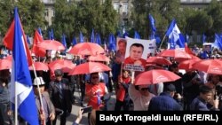«Ата Мекен» партиясынын лидери, камактагы саясатчы Өмүрбек Текебаевдин кызыл кол чатыр кармаган тарапкерлери Жогорку соттун алдында өтүп жаткан Текебаевди жана Жапаровду колдоо митингине келип кошулду.