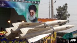Хасан Рухани (трибунада ак селдечен) Тегерандагы аскерий парадга көз салууда. 22-сентябрь, 2013