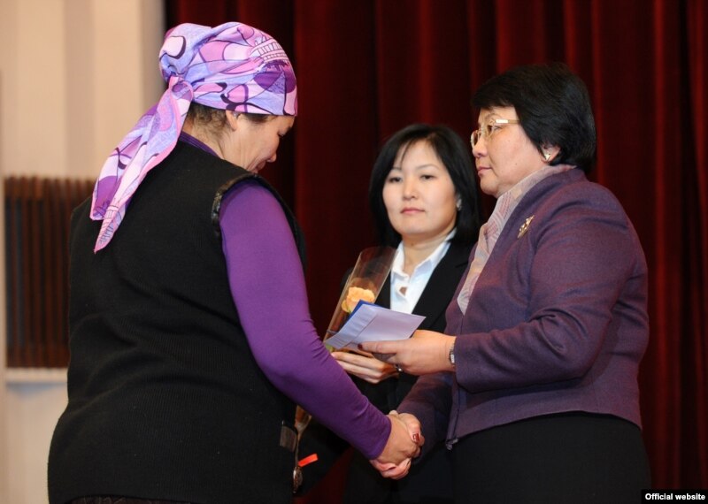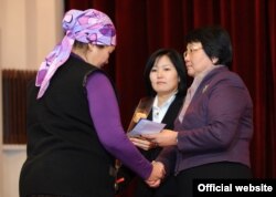 Президент Роза Отунбаева апрель окуясында курман болгондордун жакындарына сыйлык тапшырууда, 15-ноябрь.